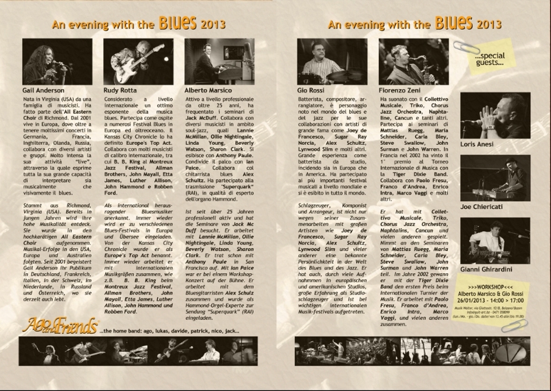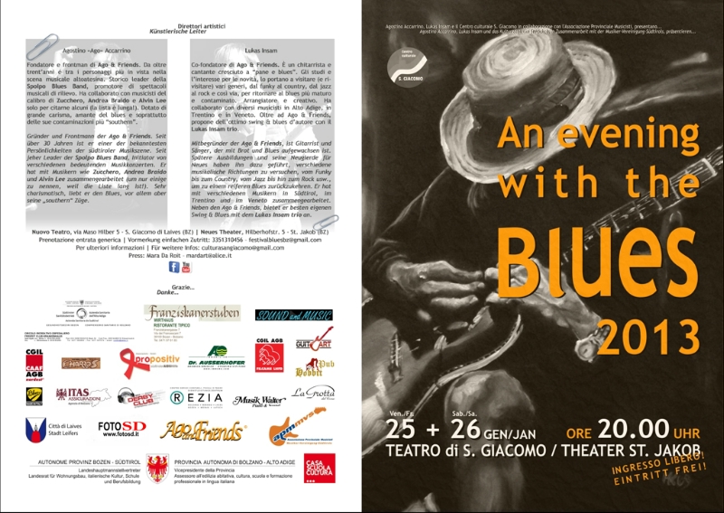 Der Kulturreferent der Gemeinde Leifers Dino Gagliardini gab bei der Pressekonferenz seiner Freude darüber Ausdruck, dass mit diesem Projekt Kunst und Kultur in ihren vielfältigen Ausdrucksformen vermittelt werden; es sei auch geplant, das Blues-Festival an andere Musik-Festivals - etwa in Innsbruck - anzukoppeln. Als künstlerischer Leiter von "An evening with the blues" agieren Agostino Accarrino, der seit über dreißig Jahren auf der Bühne musiziert, und sein Musikerkollege Lukas Insam von "Ago & Friends" und der "Spolpo Blues Band". Leitmotiv des Festivals, unterstrichen beide, ist das Zusammenspiel zwischen heimischen und national und international bekannten Blues-Musikern.