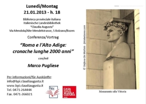 Marco Pugliese spricht über sein Werk mit dem Titel "Roma e l'Alto Adige: Cronache lunghe 2000 anni" am Montag, dem 21. Jänner, ab 18.00 Uhr in der italienischen Landesbibliothek "Claudia Augusta".