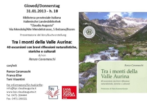 LPA - Zu einer Buchvorstellung über Wanderungen in den Ahrntaler Bergen aus der Feder des aus Bozen stammenden Verfassers Renzo Caramaschi lädt am morgigen Donnerstag, dem 31. Jänner, bei freiem Eintritt die italienische Landesbibliothek "Claudia Augusta".