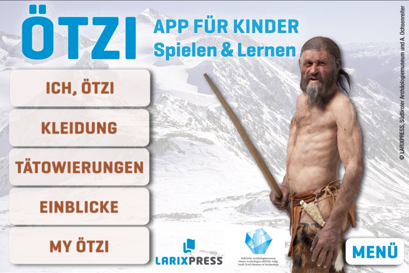 Die Ötzi-App für Kinder kann auf iPhone oder iPad heruntergeladen werden und vermittelt kleinen Leuten spielerisch das Thema "Mann aus dem Eis". Neben den neuesten Erkenntnissen der Wissenschaft finden sich Erklärungen zu seiner Ausrüstung und seinen Tätowierungen, die aus nächster Nähe genauestens untersucht werden können.