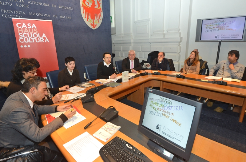"Fatti di parole. Percorsi creativi di cittadinanza verso Resistenze 2013": Unter diesem Motto stehen die dreizehn Veranstaltungen in Bozen und weitere in Leifers, Meran, Brixen, Bruneck, Eppan und Neumarkt in den kommenden Wochen. "Ziel ist es", erklärte Landesrat Christian Tommasini bei der Vorstellung, "den Grad der Beteiligung am gesellschaftlichen Leben ansteigen zu lassen." Miteinbezogen werden Schulen, thematisiert werden etwa Verantwortung und Kommunikation, konkret gearbeitet wird in Seminaren über Fotografie und Interviews und in einer Schreibwerkstatt. Bis auf eine Veranstaltung ist die Teilnahme an allen Angeboten kostenlos.