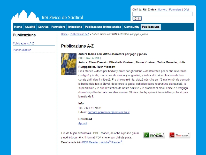 Alle in ladinischer Sprache erschienenen Veröffentlichungen sind in der neuen Rubrik einsehbar: www.provinzia.bz.it/la/publicaziuns/publicaziuns.asp