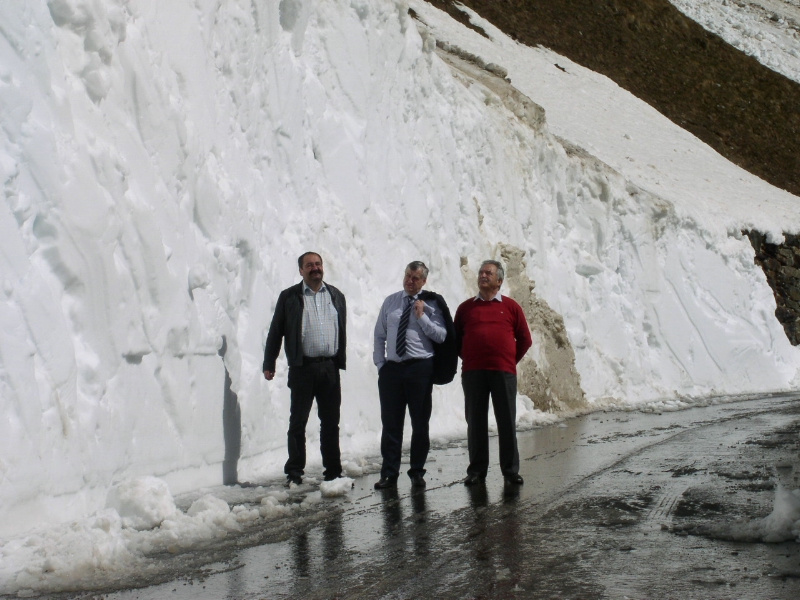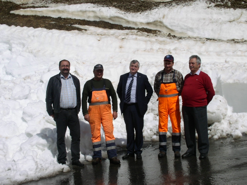 LPA - Rechtzeitig für die Durchfahrt des Giro d´Italia am 24. Mai soll die Passtraße aufs Stilfser Joch frei befahrbar sein. Landesrat Florian Mussner hat sich am Wochenende mit dem Stilfser Bürgermeisters Hartwig Tschenett und Werner Stecher vom Straßendienst Vinschgau bei Weissknott ein Bild von den Schneeräumungsarbeiten gemacht.