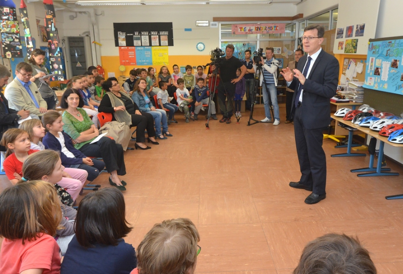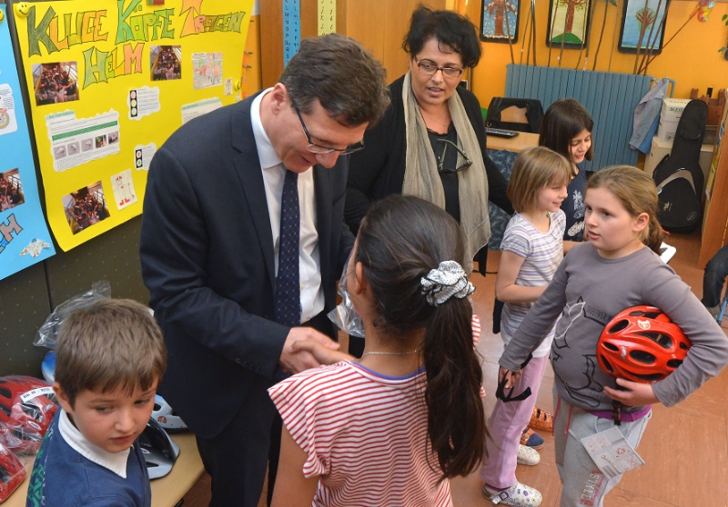 LPA - Insgesamt 2865 Helme werden jetzt an Kinder der dritten Grundschulklassen verteilt. Zum Auftakt haben heute (14. Mai) Schulamtsleiter Höllrigl und Schulamtsleiterin Minnei die ersten Helme stellvertretend an zwei Schulklassen der Grundschule "Johann Heinrich Pestalozzi" in Bozen überreicht.