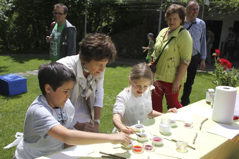 Die Mitmach-Station zur Faszination Pflanzenfarbe zeigte, dass Blüten nicht nur farbig und bunt sind, damit sie den Menschen gefallen: Die Farbe der Blüten lockt etwa Bienen an, welche die Pollen der Pflanze weiter tragen und so für Nachwuchs sorgen. Auch die Menschen finden weitere Verwendung für die bunten Blütenblätter und Farbstoffe der Pflanzen: in der Malerei. Vroni S. Meraner fertigte die ersten Trauttmansdorff Blumenbilder aus Naturfarben an; besonders die jungen Gartengäste taten es ihr nach und nahmen die selbst gemachten Blumenportraits als Erinnerung mit nach Hause.