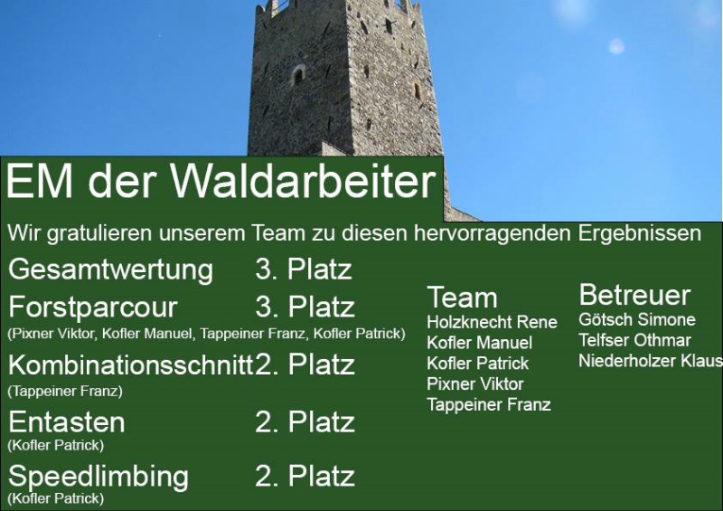LPA - In St. Andrä in Kärnten wurde die Europameisterschaften der Waldarbeiten für Schülerinnen und Schüler ausgetragen; dabei kämpften rund 70 Schüler aus 16 europäischen Nationen um den begehrten Europameistertitel. Für Italien ging die Mannschaft der Fachschule Fürstenburg an den Start und konnte sich den dritten Gesamtrang sichern. Europameister wurde die Mannschaft aus Slowenien.