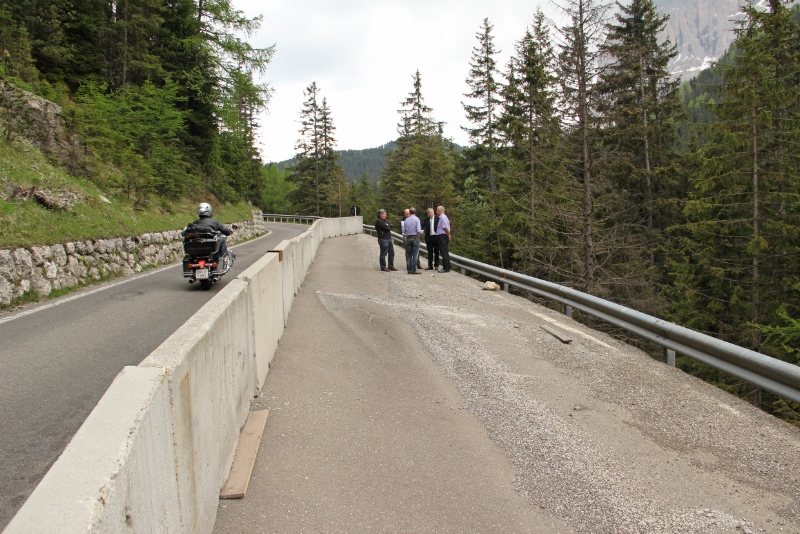 LPA - Auf der Straße von Wolkenstein Richtung Grödnerjoch und Sellajoch bei Plan de Gralba sind dringende Straßenerhaltungsmaßnahmen nötig: Davon konnte sich Landesrat Florian Mussner bei einem Lokalaugenschein überzeugen.