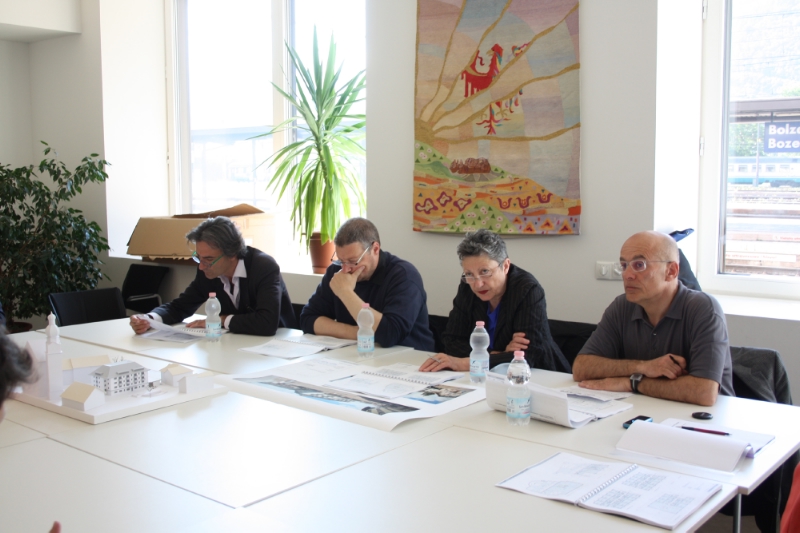 Eingehend besprochen wurde insbesondere der Eingangsbereich zum unterirdischen Geschäft und zur Garage: "Der Vorbau soll", so Landesbeiratsmitglied Sonja Gasparin, "so klein als möglich ausfallen, um den Abstand zum nahe gelegenen denkmalgeschützten Gebäude der alten Gemeinde zu gewähren." Dieter Jüngling betonte, dass der Vorbau eine eigene Sprache sprechen sollte, "wo zierliche Elemente im Gegensatz zum massiven Bau eine spannenden Dialog erzeugen könnten." Sergio Pascolo unterstrich die Wichtigkeit der Materialien und der Farbgebung des Komplexes an dieser prominenten Lage, und regte die Planer an, Materialproben zu erstellen.