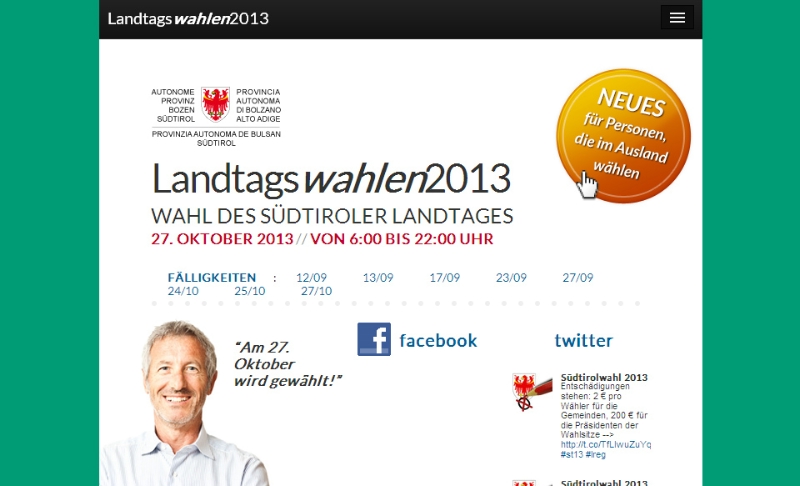 Ein Internetportal mit allen wichtigen Informationen rund um die Landtagswahlen - sowohl für die Wähler, als auch für Parteien, Kandidaten und die Gemeinden - ist ab sofort online. Der Internetauftritt wahlen.provinz.bz.it, der von der Generaldirektion des Landes eingerichtet worden ist, ist in Form einer "One-Page"-Webseite aufgebaut. Dabei werden alle Inhalte übersichtlich auf einer Seite dargestellt. Dadurch ist die Bedienung äußerst einfach und der Nutzer muss sich nicht durch mehrere Seiten klicken, um zur gewünschten Information zu gelangen.