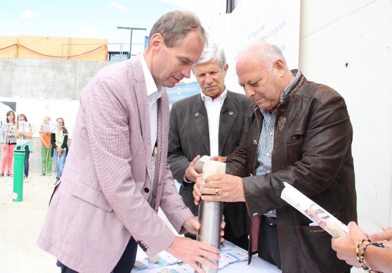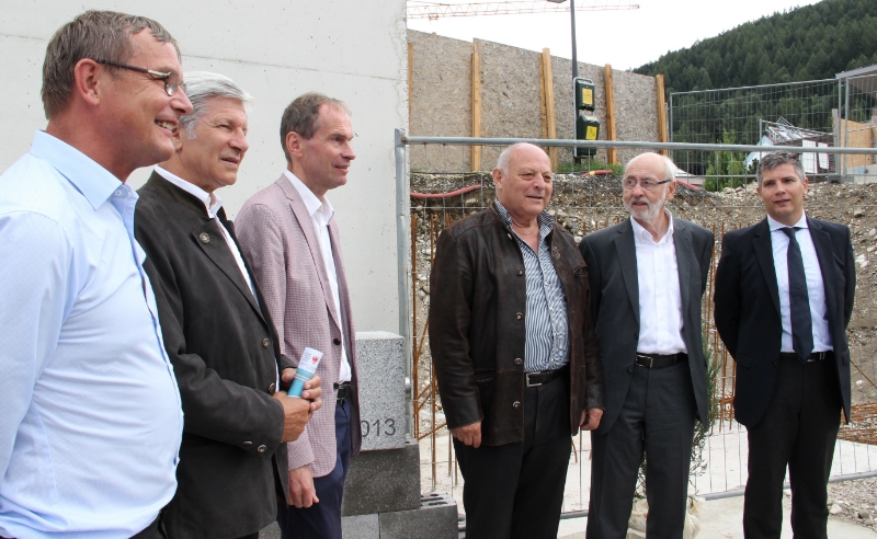 Treffpunkt werden", sagte Landeshauptmann Durnwalder auf der Baustelle für die Halle, an deren Grundmauern bereits gebaut wird. Landeshauptmann Durnwalder hat gemeinsam mit Senator Hans Berger und dem Brunecker Bürgermeister Christian Tschurtschenthaler die Bauurkunde unterschrieben und in einen Stein für die Grundmauer gesteckt. Dekan Josef Wieser segnete den Grundstein und die Baustelle.