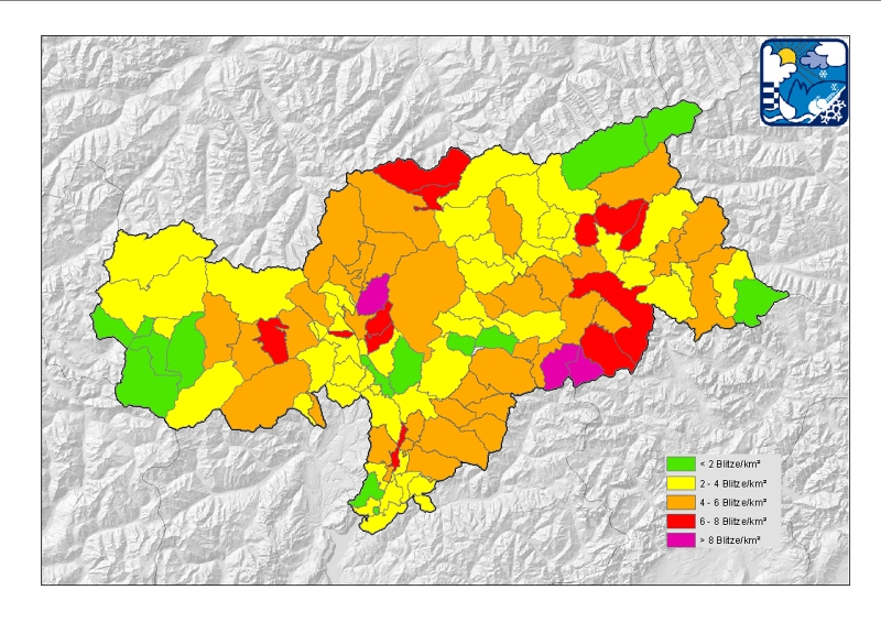Die Niederschläge fallen im Sommer gewöhnlich in Form von Gewittern, die es auch im heurigen Sommer wieder zahlreich gab. Das Blitzortungssystem hat in Südtirol über 29.000 Blitzeinschläge registriert. Der blitzreichste Tag des Jahres war der 4. August mit 2849 Einschlägen. Die Gemeinde mit der größten Blitzdichte war Wolkenstein, gefolgt von Schenna und Corvara. Zu den blitzärmsten Gemeinden zählen Waidbruck, sowie Prad a.S. und Taufers i.M.. Das für die Landwirtschaft folgenschwerste Gewitter zog am 22. Juli über den Vinschgau, das Burggrafenamt und das Unterland hinweg. Die größten Hagelschäden wurden aus den Gemeinden Auer, Montan und Neumarkt gemeldet. Heftige Unwetter gab es auch in der Nacht vom 20. auf 21. Juni im Burggrafenamt, besonders rund um Burgstall und am 27. Juli im Raum Bruneck während des Altstadtfestes.