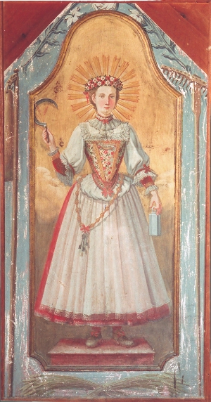 Bei diesem Gemälde handelt es sich um das Türblatt zu einem Schrank, in dem die Prozessionsfigur der hl. Notburga aufbewahrt wird. In zahlreichen Kirchen des Landes finden sich Statuen dieser Heiligen, die nach wie vor bei Prozessionen mitgetragen werden.