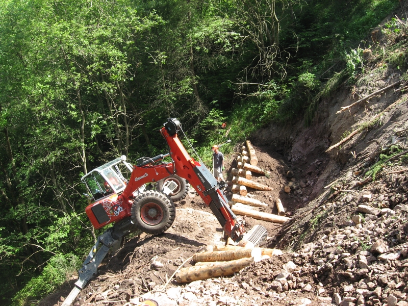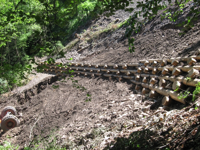 Unter der Bauaufsicht von Projektant Thomas Thaler wurde der im Vorjahr entstandene Anbruch mit zwei bepflanzten Holzkrainerwänden verbaut. Dabei handelt es sich um zwei Holzkästen, deren Holzelemente vier Meter breit sind und bis zu zwei Metern in den Hang hineinreichen. Befestigt sind die Elemente untereinander mit Eisenstiften. Zwischenräume wurden mit Schotter- und Erdmaterial aufgefüllt. In der Vorderansicht sind die Holzkrainerwände mit Laubhölzern bepflanzt. „Der Vorteil der Holzkrainerwände liegt auf der Hand: Sie sind leichter als Beton und günstiger in der Ausführung, weil kleinere Maschinen und Handarbeit zum Einsatz kommen", sagt Abteilungsdirektor Pollinger. Außerdem fällt der aufwändige Bau von größeren Zufahrtsstraßen weg. Als Holz wurde Lärche oder Eiche verwendet. „Dieses Holz ist zwar nicht so langlebig, aber sobald die Tragfähigkeit des Holzes nachgelassen hat, sollten die Wurzeln der Laubhölzer den Hang befestigen können", erklärt Thaler. Wert legte Thaler vor allem darauf, dass die Pflanzen dem Standort, der Meereshöhe, den Lichtverhältnissen und der Feuchtigkeit angepasst wurden, damit sie sich optimal entwickeln und ihre Aufgaben erfüllen. Produziert wurden die Laubgehölze im hauseigenen Pflanzgarten der Landesabteilung Wasserschutzbauten in Prad am Stilfserjoch.