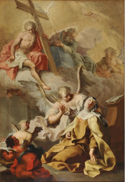 Das Gemälde zeigt die am Boden kniende und in Verzückung nach hinten sinkende Heilige Theresia von Ávila. Ein Engel an ihrer Seite stützt sie und hält ihr gleichzeitig einen brennenden Pfeil an die Brust. Über ihr thront auf Wolken die Heilige Dreifaltigkeit, die sich huldvoll zu Theresia herabneigt. Zwei mit Büchern hantierende Engelsputten links im Vordergrund beobachten interessiert die in Verzückung geratene Theresia.