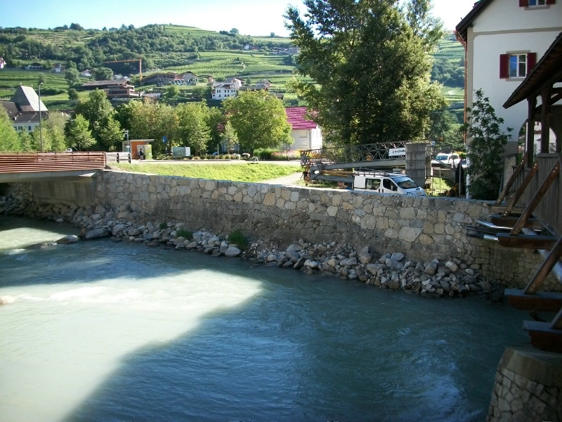 Zwischen der neuen Zufahrtsstraße zum Kloster Neustift und der Holzbrücke beim Brückenwirt ist die Ufermauer des Eisacks auf der orografisch rechten Seite abgebrochen und aufgehöht worden. Vor dem Baueingriff war hier die Ufermauer niedriger und stellte bei einem Hochwasser eine Schwachstelle dar. „Das Umland beim Brückenwirt hätte überschwemmt werden können, nun ist die Gefahrenstelle entschärft", sagt Rudolf Pollinger, Direktor der Landesabteilung Wasserschutzbauten. Besonderes Augenmerk galt während der Ausführung der Arbeiten dem ursprünglichen Baucharakter der Mauer. Auf einer Länge von 33 Metern haben Vorarbeiter Hubert Rungger und sein Bautrupp neueres Mörtelmauerwerk durch Granitsteine ersetzt und somit ein einheitliches ästhetisches Erscheinungsbild erzielt.