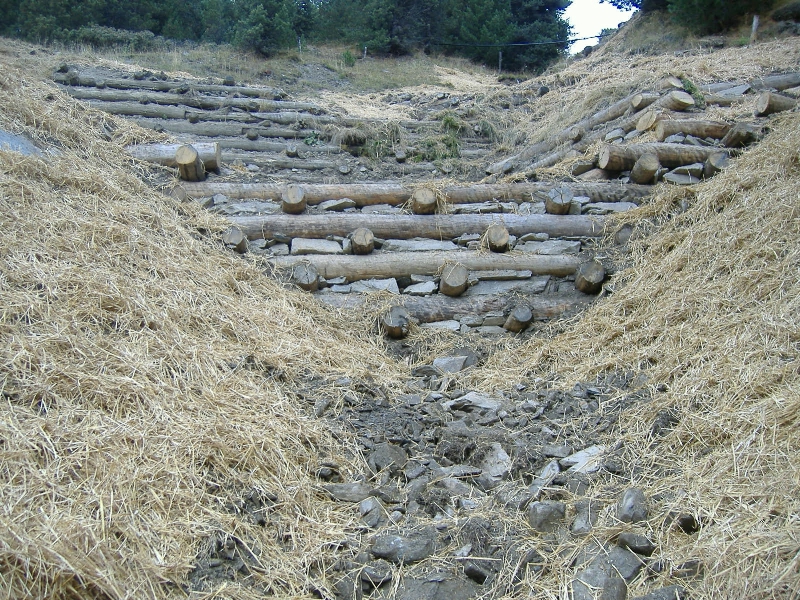 In einem ersten Arbeitsschritt haben die Mitarbeiter des Landesamts für Wildbach- und Lawinenverbauung Nord etwas oberhalb der Straße „Palmschloss" die bestehende Sperrenstaffelung und die Ufermauer durch den Einbau von weiteren Sperren aus Zyklopensteinen mit Beton gesichert. Weiter oben im Bereich der Waldgrenze haben Vorarbeiter Raimund Überbacher und sein Bautrupp zudem einige Holzsperren saniert, die durch ein Unwetter unterspült worden waren. „Drei neue Sperren in Holzbauweise stabilisieren nun den sehr steilen Graben und verhindern gleichzeitig, dass weiter oberhalb gelegene Bauwerke durch Tiefenerosion beschädigt werden", erklärt der Projektant und Bauleiter Philipp Walder vom zuständigen Landesamt. Abschließend sind die Bereiche begrünt und zum Schutz mit Stroh abgedeckt worden.
