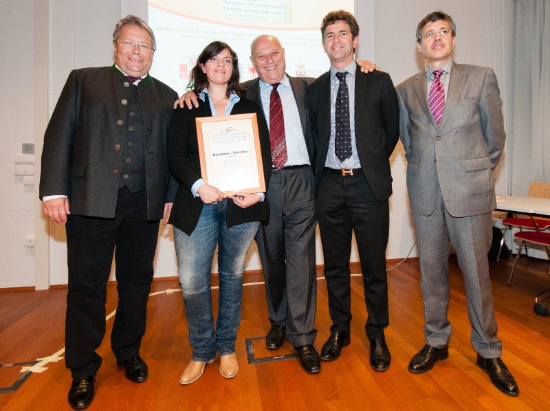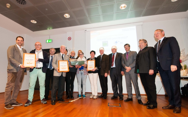 Der Landeshauptmann war es dann auch, der die vier Siegerprojekte heute in der Messe Bozen mit Nationalrat Franz Hörl als Vertreter des Bundeslands Tirol und Paolo Nicoletti, Leiter der Trentiner Landesabteilung für Landwirtschaft und Tourismus, prämiert hat. Gekürt worden waren sie von einer Fachjury, und zwar für alle drei Euregio-Länder. In Südtirol gibt's dabei zwei ex-aequo-Sieger. Das eine ist das Projekt "Pur Südtirol - die Genussmärkte -So schmeckt unser Land" der Meraner Weinhaus GmbH, die zwei Genussmärkte in Meran und Bruneck sowie zehn weitere Verkaufspunkte in Geschäften im ganzen Land betreibt. Dort werden 1600 Produkte von 137 Bauern und 28 bäuerlichen Genossenschaften verkauft, wobei die Kunden je zur Hälfte Südtiroler bzw. Touristen sind. Zudem werden die bäuerlichen Produkte auch online vertrieben, der Online-Shop verzeichnet rund 2000 Besucher in der Woche.