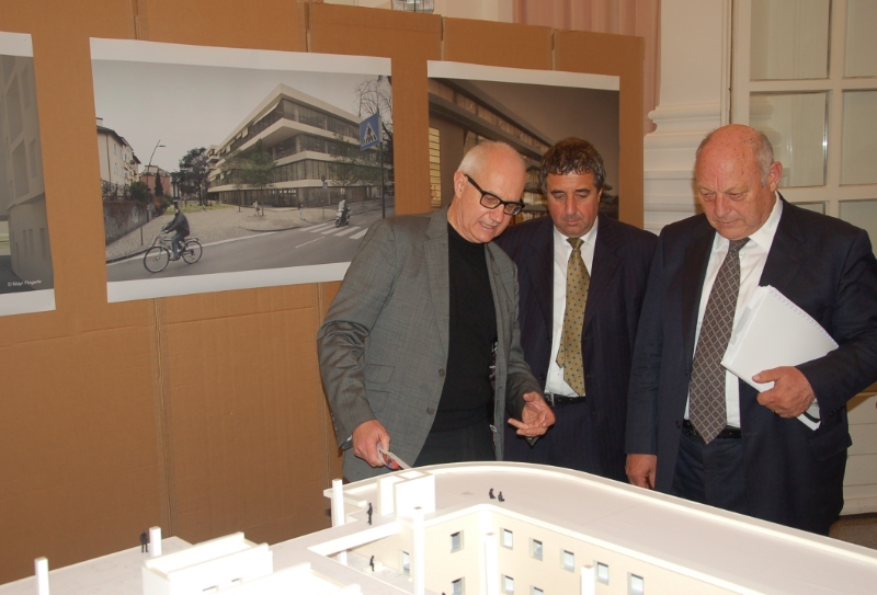 Für die Errichtung des Bibliothekenzentrums wurde ein internationaler Projektierungswettbewerb ausgelobt, der im Jahr 2006 abgeschlossen wurde und den der Bozner Architekt Christoph Mayr Fingerle für sich entschieden hat. Das Siegerprojekt wurde in Folge überarbeitet, um den Erhalt des Eingangsbereichs, der Hauptfassade und der Haupttreppe der Pascoli-Schule zu ermöglichen. Mayr Fingerle hat das Projekt mit seinen vier ober- und drei unterirdischen Geschossen heute im Detail vorgestellt.