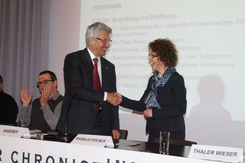 "Ihre Tätigkeit", wandte sich die Kulturlandesrätin an die zahlreichen Chronistinnen und Chronisten, "ist eine wichtige und wertvolle Kulturarbeit, die auf die Zukunft ausgerichtet ist". Ihre Arbeit, hob sie hervor, könne von der Landesverwaltung nicht bezahlt werden, wohl aber gestärkt, unterstützt und begleitet. Besonders dankte sie Landesarchivdirektorin Christine Roilo und ihrem Vorgänger Josef Nössing, Chronik-Referentin Margot Pizzini und dem scheidenden ersten Südtiroler Landeschronisten Robert Kaserer. Der Tscharser, der mit dem 10. Jänner 2010 dieses Amt übernommen hatte, erzählte von seinen Anfängen als Lehrer, dem sich wegen mangelnder Geschichtsbücher durch die selbstständige Erarbeitung von Unterlagen die Welt der Chronik erschloss. Seine Nachfolgerin Rita Thaler Wieser von der Geschichtswerkstatt Freienfeld nannte als fünf Schwerpunkte ihrer Arbeit die Imagestärkung und Öffentlichkeitsarbeit, die Verbesserung der Jahres- und Ereignischronik, die Aus- und Weiterbildung, die Notwendigkeit einer stärkeren Teambildung und den Ausbau der Netzwerkarbeit nach innen wie nach außen.