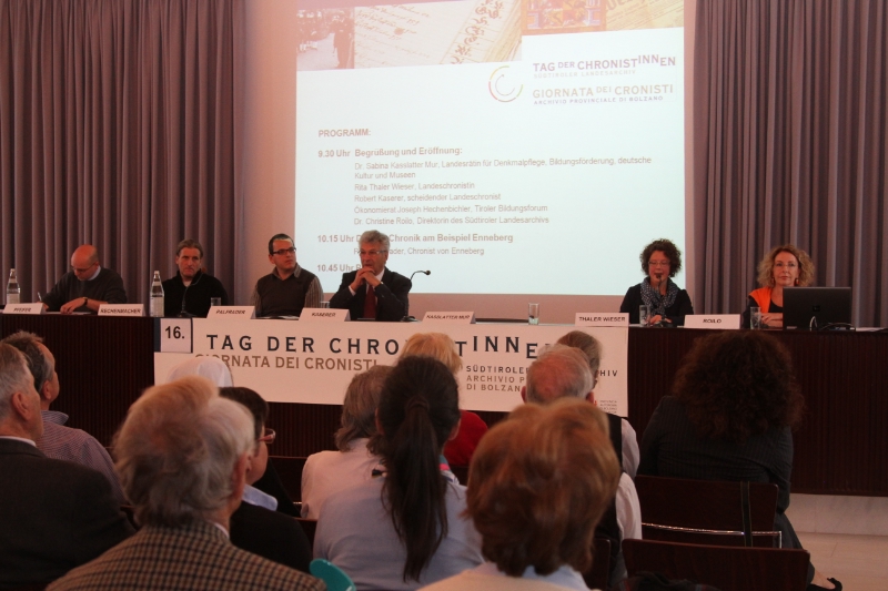Der Enneberger Journalist und Chronist Pablo Palfrader gab Einblick in seine Arbeit der Erstellung einer digitalen Chronik, mit der die Suchvorgänge wesentlich erleichtert und die Chroniken einem breiteren Publikum zugänglich gemacht werden können. Zudem sei das Beheben von Fehlern wie das Nachdrucken leichter. Der Schlanderser Chronist und Leiter der Mittelpunktbibliothek Schlandersburg Raimund Rechenmacher berichtete über die Möglichkeiten der Zusammenarbeit zwischen Chronistinnen und Chronisten und Bibliotheken. Abschließend referierte der stellvertretende Landesarchivdirektor Gustav Pfeifer über die Übergabe Tirols an Habsburg vor achthundert Jahren.