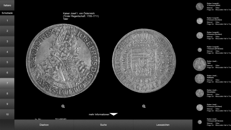 Die zweite Neuheit ist die Münzstation in der Turris parva: In einem nachgeahmten Tresor mit zehn Schubladen findet der beträchtliche Münz-Bestand Schloss Tirols seinen Platz. Zu sehen sind rund 140 Exemplare, vom Adlergroschen Meinhards II. bis zu den Gedenkmedaillen des 20. Jahrhunderts. Eine spezielle Computer-Animation sorgt für zusätzliche Informationen, die den Laien und Experten gleichermaßen auf eine Reise in die spannende Welt der Numismatik schicken.