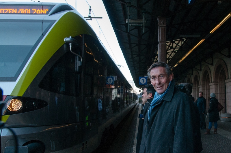 Mit Inkrafttreten des Winterfahrplans übermorgen Sonntag, 15. Dezember, nehmen sechs neue FLIRT-Züge ihren Liniendienst auf. Erstmals wird dann eine Direktverbindung Bozen-Innsbruck angeboten. Landesrat Thomas Widmann hat den Komfort der neuen Züge bereits auf einer Probefahrt getestet, denn eine der neuen Garnituren wird seit heute (13. Dezember) auf der Strecke Bozen-Meran eingesetzt.