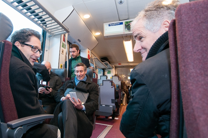 "In den Sommermonaten sind die ersten FLIRT-Garnituren geliefert worden und nach den nötigen Testfahrten sowie dem Zulassungsverfahren sind sechs Züge jetzt einsatzbereit; zwei weitere werden Anfang 2014 geliefert", so Mobilitätslandesrat Widmann heute bei der ersten Fahrt des neuen Zuges. Gemeinsam mit Trenitalia-Regionaldirektor Roger Hopfinger, Maurizio Chiusa, dem Bahndirektor der SAD, und dem Direktor der STA - Südtiroler Transportstrukturen AG Joachim Dejaco, hat sich Widmann auf der Strecke Bozen-Meran vom hohen Komfort, der erleichterten Zugänglichkeit und der modernen Ausstattung der Züge überzeugt.