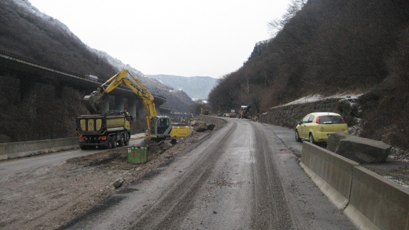 Sämtliche Arbeiten in der Nähe der Abbruchstelle werden von der Landesabteilung Tiefbau koordiniert. Nach den ersten dringenden Eingriffen der Landesabteilung Straßendienst in Absprache mit dem Landesamt für Geologie und Baustoffprüfung, hat das Unternehmen „Gregorbau" aus Blumau bereits am vergangenen Wochenende die Arbeiten für den Bau des neuen Straßenabschnitts aufgenommen. Die Zuweisung der Arbeiten erfolgte in Rekordzeit, und zwar bereits am 24. Jänner, aufgrund eines informalen Wettbewerbs zu dem vier Unternehmen aus der Gegend eingeladen wurden. Für die Arbeiten gilt nämlich die höchste Dringlichkeitsstufe.