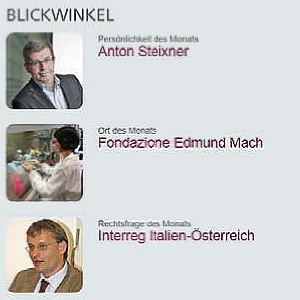 Wussten Sie, dass die Fondazione Edmund Mach, das ehemalige Agrarinstitut in San Michele das Trentiner Pendant zur Laimburg in Südtirol und zum Agrarinstitut Rotholz in Tirol ist, wenn es um Forschung in der Landwirtschaft geht? Ist Ihnen der Name Anton Steixner ein Begriff? Der ehemalige Tiroler Landesrat ist einer der Väter der grenzüberschreitenden "Milchehe" zwischen den Wipptaler Bauern nördlich und südlich des Brenners. Mit dem heurigen Jahr 2014 startet die neue Periode des EU-Programmes Interreg Italien-Österreich. Details und aktuelle Videos zu den neuen Monatsthemen sind - neben aktuellen Pressemitteilungen, Veranstaltungshinweisen und Projekthinweisen - auf der "Bürger"-Seite der Homepage der Europaregion Tirol-Südtirol-Trentino unter www.europaregion.info/ zu finden.