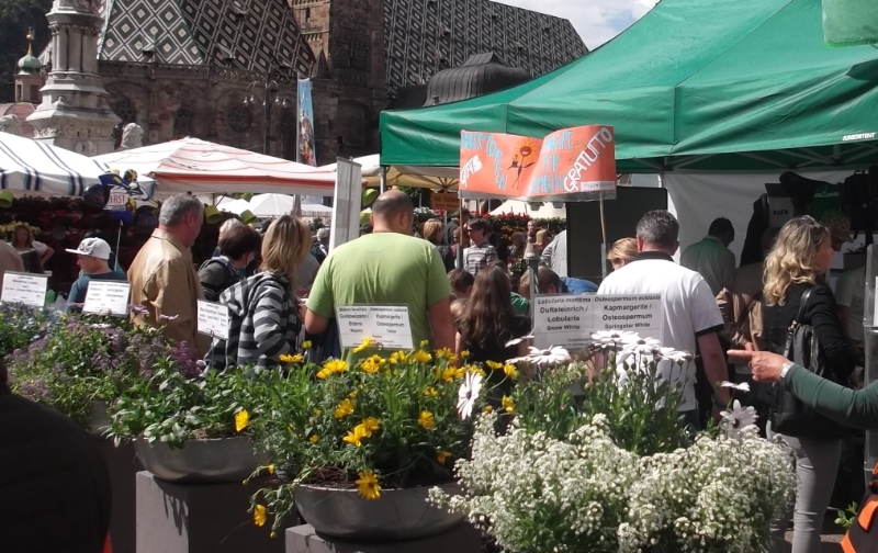 Die Schülerinnen und Schüler gemeinsam mit den Lehrkräften waren am traditionellen Blumenmarkt am Bozner Waltherplatz mit einem Informationsstand vertreten und haben in Zusammenarbeit mit den Südtiroler Junggärtnern den Marktbesuchern Auskunft über die Eigenschaften von Alternativkulturen zu Geranien und Petunien für Beet- und Balkonbepflanzungen gegeben.