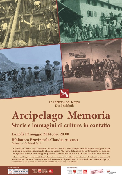 In Zusammenarbeit mit dem Verein "La Fabbrica del tempo" lädt die italienische Landesbibliothek "Claudia Augusta" am Montag, dem 19. Mai, ab 20.00 Uhr in ihrem Sitz zur Vorstellung von Fotos und Filmen unter dem Titel "Arcipelago Memoria - Storie e immagini di culture in contatto": Es moderiert die Publizistin und Lehrerin Alessandra Zendron; der Eintritt zu der Veranstaltung ist frei.