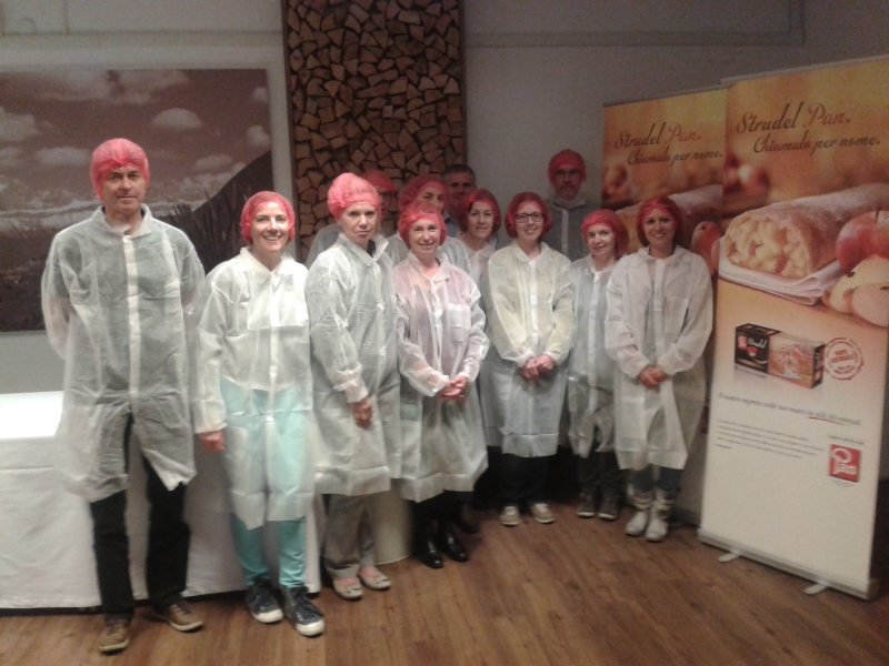 Ein Besuch der Berufsberaterinnen und Berufsberater stand auch bei „Pan - Tiefkühlprodukte" in Leifers auf dem Programm. „Pan", ebenfalls ein Familienunternehmen, hat den ersten tiefgekühlten Apfelstrudel in Europa auf den Markt gebracht. Neben einer ganzen Reihe von tiefgekühlten Spezialitäten und Backwaren verlassen täglich 35 km Strudel das Werk.