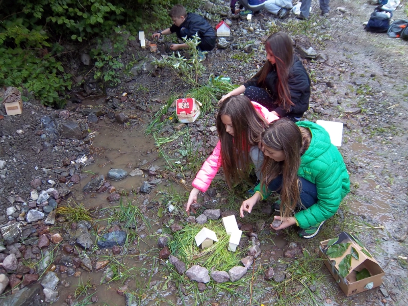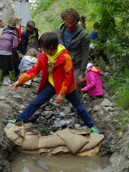 Dann wurde die Theorie in die Praxis umgesetzt: Mit Landschaftsarchitektin Marion Aschbacher und Gewässerokologen Peter Hecher von der Landesabteilung Wasserschutzbauten wurde an einem kleinen Wasserlauf neben dem Afererbach im Rückhaltbecken oberhalb des Dorfes Albeins die Erstellung eines Gefahrenzonenplanes erprobt. Die Schülerinnen und Schüler errichteten eine kleine Siedlung aus selbst gebastelten Häusern am Bach und erzeugten ein künstliches Hochwasser. Sie erstellten einen Gefahrenzonenplan und schätzten das Risiko ab, indem sie rote, blaue und gelbe Zonen einzeichneten. Ziel des Schulprojektes, erklärt Landschaftsarchitektin Aschbacher, war es, die Schülerinnen und Schüler mit dem Thema Naturgefahren vertraut zu machen und spielerisch den Gefahrenzonenplan zu veranschaulichen. Dabei, betont die Expertin, war es wichtig, den Bach nicht als gefährlich und bedrohlich darzustellen, sondern den Kindern auch zu vermitteln, wie viel Spaß es bereitet, am Bach zu bauen und zu spielen. Im Umgang mit der Natur ist jedoch Respekt wichtig, der richtige Umgang mit Naturgefahren ist grundlegend, um in Einklang mit der Natur leben zu können.
