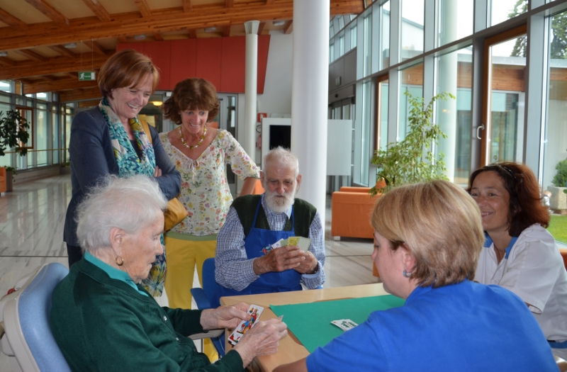 Bei einem Rundgang machte sich Stocker ein Bild von der Arbeit im Seniorenheim. Beeindruckt zeigte sich die Landesrätin von der guten Anbindung des Heims an das Dorf und der damit einhergehenden Integration der Heimbewohner ins Dorfleben. Möglich wird diese durch ein Cafe mit Terrasse, dass sowohl für die Heimbewohner als auch für alle anderen Bürger zugänglich ist.