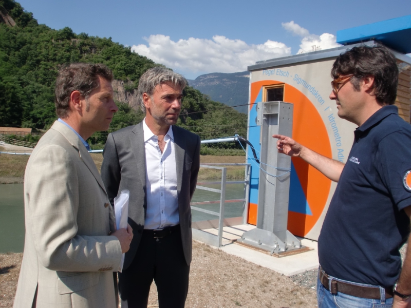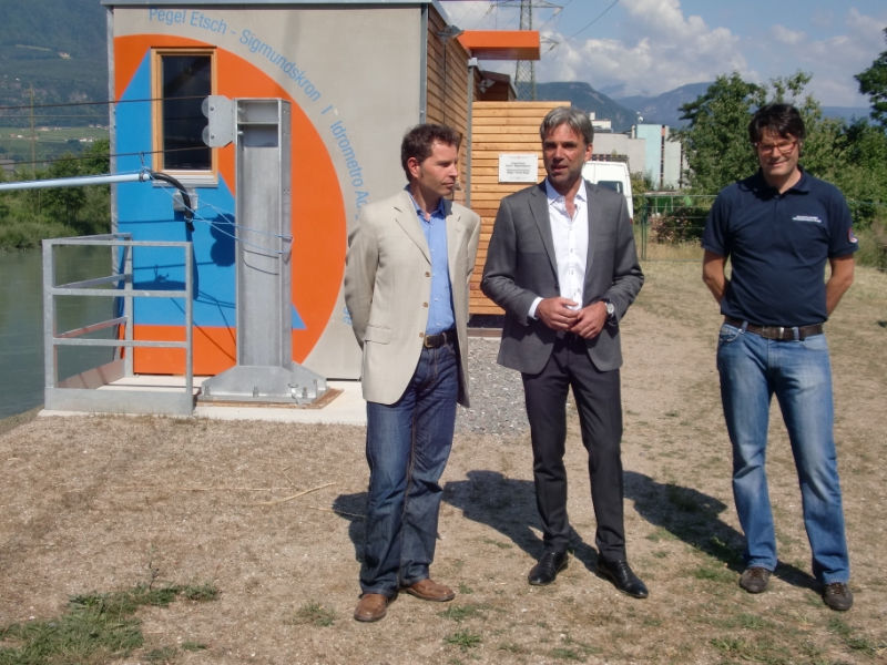 Seit bald vierzig Jahren betreibt das Hydrografische Landesamt ein landesweites Pegelmessnetz für die Überwachung der Südtiroler Fließgewässer mit 50 Messstellen. Heute (19. Juni) hat Landesrat Schuler eine neue Messstelle an der Etsch bei Sigmundskron offiziell ihrer Bestimmung übergeben.