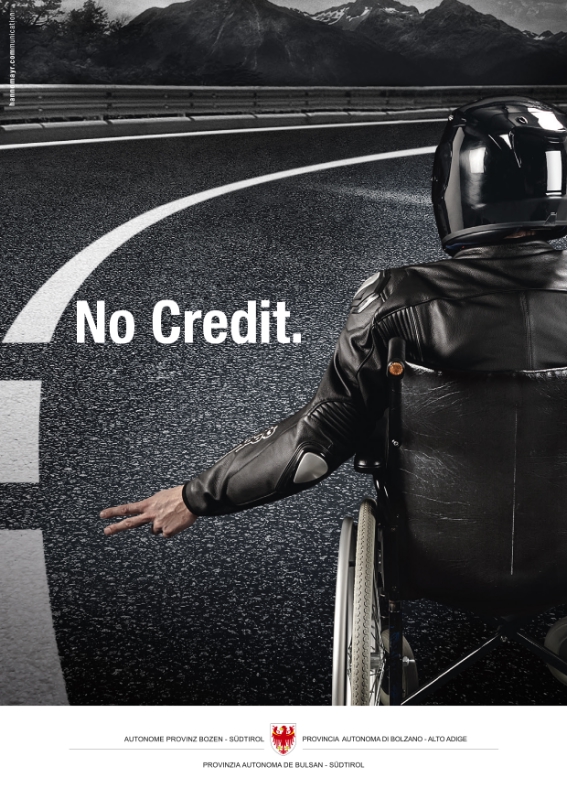 Die Kampagne "No Credit", welche Motorradfahrer gezielt zu einem sicheren und regelkonformen Verhalten im Straßenverkehr auffordert, läuft den ganzen Sommer über bis zum 30. September und beinhaltet an verkehrsreichen Wochenenden auch direkte Sensibilisierungsaktionen für Motorradfahrer auf Südtirols Straßen und Pässen.
