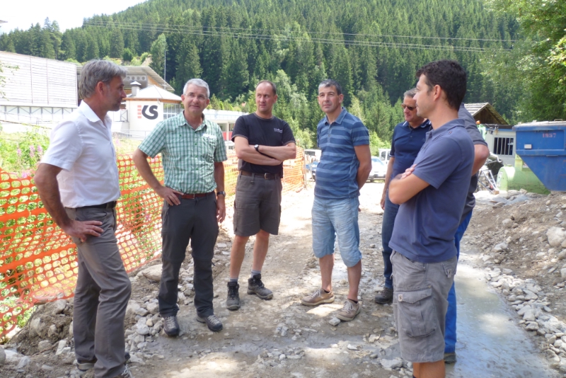 Ausgehend vom Bauhof in Rasen/Antholz, wo Landesrat Schuler von den Führungskräften und Vorarbeitern des Pustertales begrüt wurde, begann die Besichtigungstour mit der Baustelle am Taistnerbach: Dort werden Instandhaltungsarbeiten an der Künette durchgeführt, die das Dorf durchquert; nach dem Unwetter im Jahr 2008 musste die Abflusssektion vergrößert werden. Die Kosten der sechs Baulose belaufen sich auf insgesamt 1.205.000 Euro. Projektant und Bauleiter ist Thomas Gamper, Vorarbeiter Gebhard Oberarzbacher.
