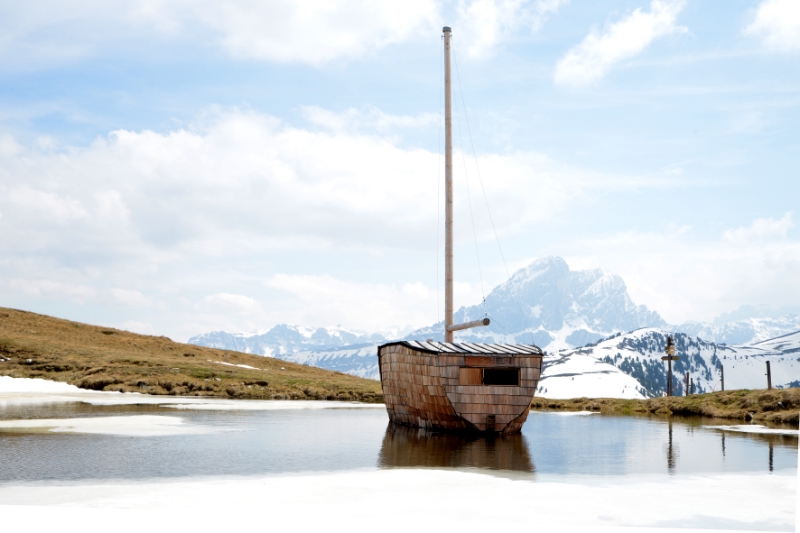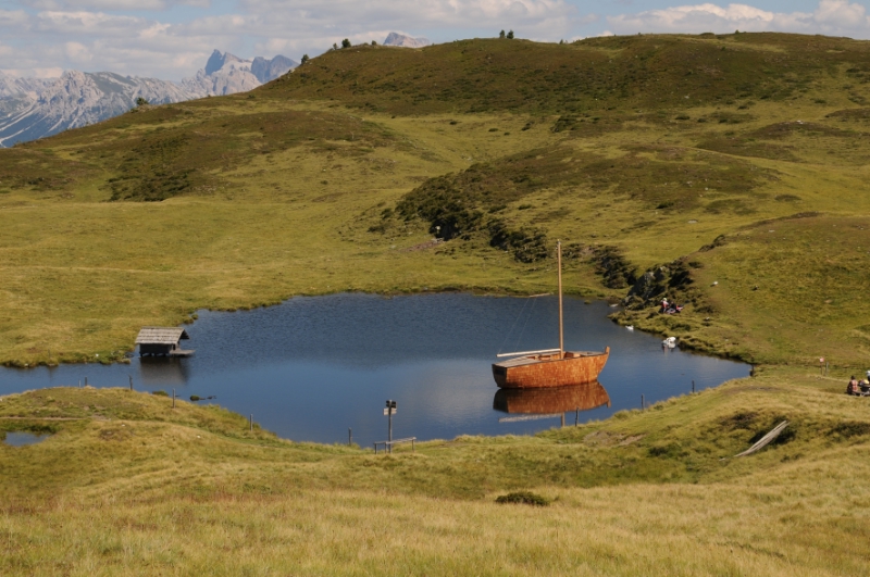 Unter dem Leitmotiv "Radikale Romantik" haben 25 Studenten der Fakultät für Architektur der Universität Innsbruck im Glittner See auf der Lüsner Alm ein Segelboot als Kunstobjekt installiert, das noch bis Ende Juni 2015 zu sehen ist.