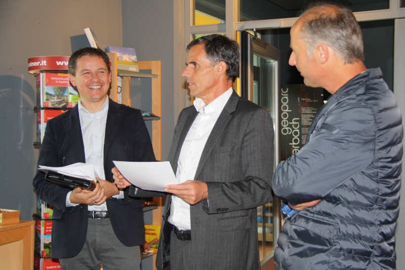 Landesrat Theiner begrüßte die enge Zusammenarbeit des GEOPARC Bletterbach mit den Akteuren vor Ort. "Schließlich tragen alle zum guten Image des Gebietes bei und sind Nutznießer dieses einzigartigen Welterbes", so Landesrat Theiner. Den Aldeiner Direktvermarktern wurde beispielsweise in den vergangenen Jahren die Möglichkeit geboten, beim Besucherzentrum an ausgewählten Tagen ihre Produkte zu verkaufen und auf sich aufmerksam zu machen. Demnächst soll eine gemeinsam Wanderkarte mit den sieben Almen des Gemeindegebietes herausgegeben werden. "Längerfristiges Ziel muss es sein, die örtliche Bevölkerung noch mehr in den GEOPARC Bletterbach als UNESCO-Welterbe einzubeziehen und nicht nur die Akzeptanz zu steigern, sondern auch einen gewissen Stolz über diesen besonderen Teil unserer Gemeinde zu schaffen", so Präsident Daldos.