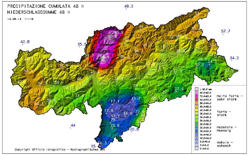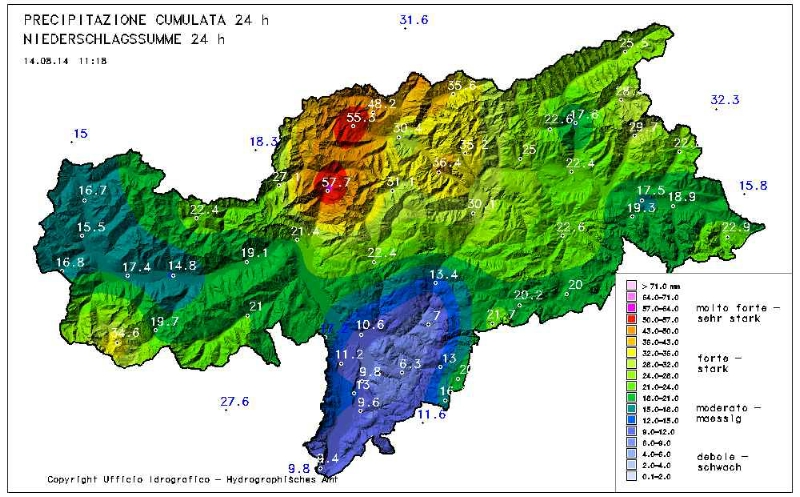 Nachdem die heftigen Niederschläge der letzten Tage gestern (13. August) vor allem an Eisack und Etsch, aber auch in Sulden und im Passeier für hohe Pegelstände und ausufernde Bäche gesorgt hatten, hat sich die Lage heute wieder beruhigt. Dies teilt der Landeszivilschutz mit. Auch beruhigend: Für das bevorstehende Wochenende werden keine heftigen Gewitter vorhergesagt.