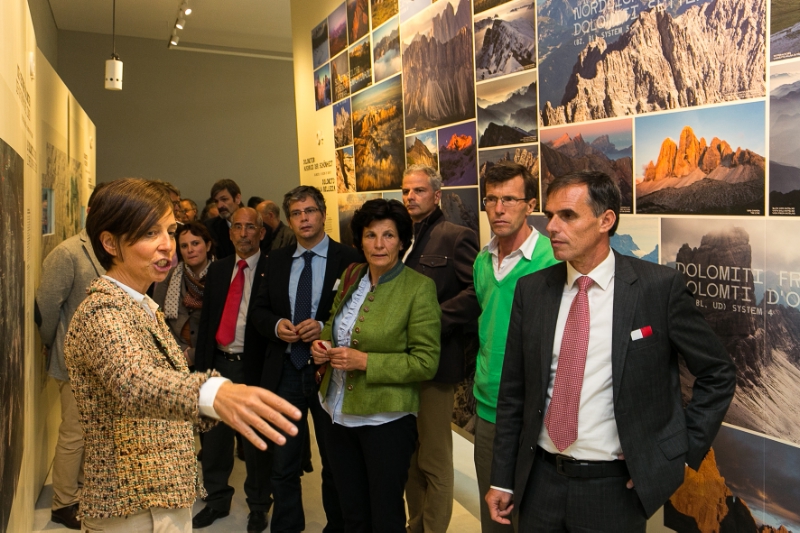 Nach den Grußworten der Ehrengäste führten Maria Margareth Pallhuber vom Landesamt für Naturparke und Emiliano Oddone von "Dolomiti Project" durch die neue Ausstellung. Sie erstreckt sich über eine Fläche von rund 250 Quadratmetern. In einem größeren Raum werden zunächst Informationen zur UNESCO, zu deren Zielsetzungen und zu anderen Welterbestätten gegeben. Dann wird auf die Situation im Alpenraum eingegangen und schließlich auf das Welterbe der Dolomiten. Im weiteren Verlauf werden die Entstehung der Sextner Dolomiten im Meer und ihre bewegte Entstehungsgeschichte bis herauf in die Gegenwart aufgezeigt. Die gesamte Ausstellung präsentiert sich in Form von Texten, Bildern, Illustrationen und Animationen sowie Audio- und Videoeinspielungen. Zu den besonderen Ausstellungselementen zählen ein Holzmodell mit detailgenau herausgefräster Landschaft der Sextner Dolomiten sowie eine Weltkugel, auf der eine Auswahl von Welterbestätten abgebildet ist. In einem Nebenraum wird die landschaftliche Schönheit der Sextner Dolomiten über drei Wände großformatig in Szene gesetzt.