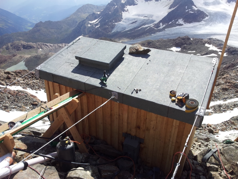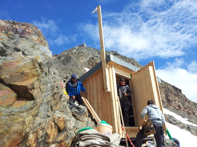 Das fast 3200 Meter hoch in den Stubaier Alpen gelegene Becherhaus ist eine der Schutzhütten, die das Land Südtirol übernommen hat. In der vergangenen Woche hat man nun ein Schönwetterfenster genutzt und im Auftrag des Landesamts für Bauerhaltung die Wasserversorgung der Hütte rundum erneuert. Herzstück der Anlage ist eine neue Wasserfassung am Übeltalferner in 2925 Metern Meereshöhe, in der das Gletscherwasser in einem 1800 Liter fassenden Tank gesammelt und danach über 275 Höhenmeter in das Schutzhaus gepumpt wird.