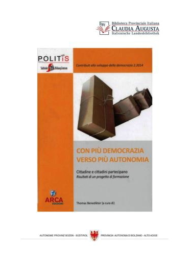 Einen Band über Demokratie und Autonomie stellen Thomas Benedikter, Alberto Stenico und Lucio Giudicandrea an diesem Montag in der italienischen Landesbibliothek Claudia Augusta in Bozen vor; der Eintritt zu der Veranstaltung ist frei.
