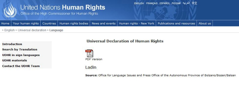 "Dötes les porsones nasc lëdies y cun la medema dignité y i medemi dërć. Ares à na rajun y na cosciënza y mëss s'incuntè öna cun l'atra te n spirit de fraternité." So liest sich Artikel 1 der Menschenrechtscharta auf Gadertalerisch. Es ist dies die 439 Sprache, in welche die "Allgemeinen Erklärung der Menschenrechte" übersetzt worden ist. Zu finden ist die ladinische Übersetzung seit wenigen Tagen auf der Web-Seite des Hohen Kommissar der Vereinten Nationen für Menschenrechte (United Nations High Commissioner for Human Rights, UNHCHR) unter www.ohchr.org/EN/UDHR/Pages/Language.aspx?LangID=lld.