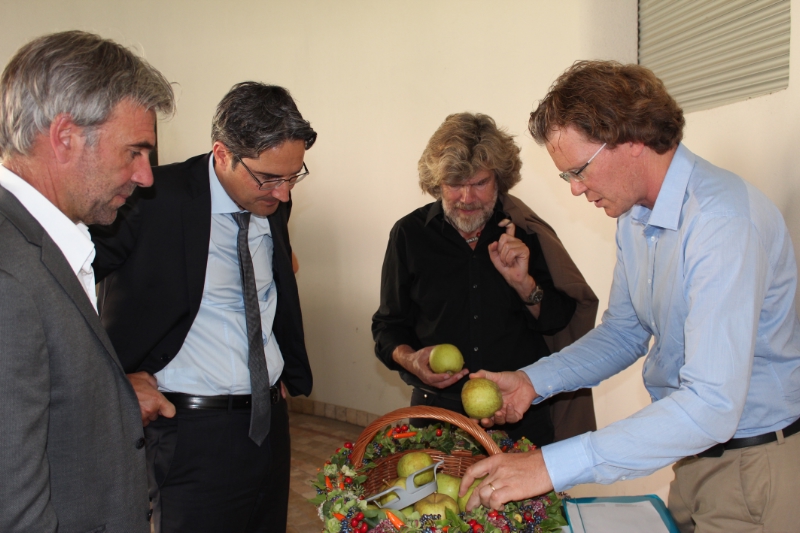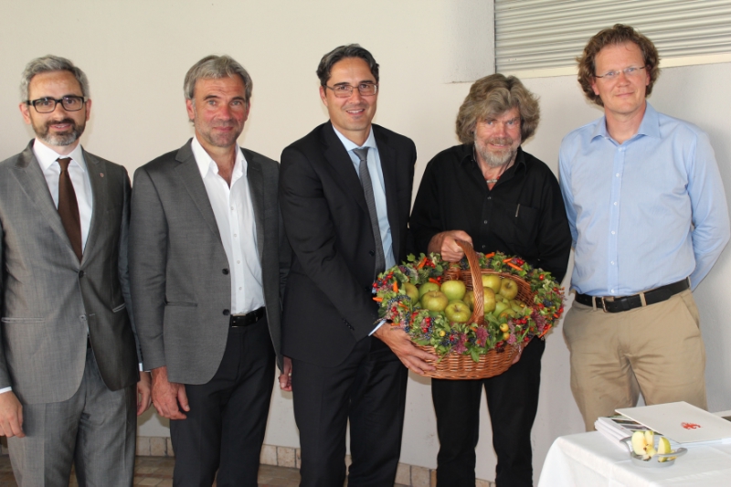 Einen weiteren Achttausender gab's heute (22. September) für Reinhold Messner, diesmal geschenkt: Landeshauptmann Arno Kompatscher und Landesrat Arnold Schuler haben Messner wenige Tage nach dessen 70. Geburtstag eine von der Laimburg entwickelte Apfelsorte überreicht, die - zufällig, aber deshalb nicht weniger passend - den Sortennamen "Lb 8000" trägt.