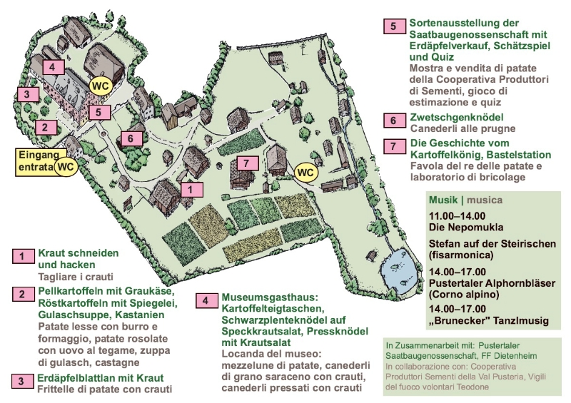 Wie aus "Kobis" und Rüben Kraut gemacht wird, dabei können Besuchende am kommenden Sonntag im Volkskundemuseum zuschauen. Bei Musik und in festlicher Atmosphäre dürfen sie zudem Gerichte aus Kartoffeln und Kraut verkosten, wie etwa Erdäpfelblattlan mit Kraut, Kartoffelteigtaschen, Zwetschgenknödel oder Schwarzplente-Knödel auf Speckkrautsalat. Fachleute der Pustertaler Saatbaugenossenschaft informieren zudem über aktuelle Erdäpfelsorten. Für die ganze Familie gibt es ein Schätzspiel. Mittels eines Rätselspiels können Kinder das gesamte Museumsgelände erkunden. In einer gemütlichen Stube lernen sie den Kartoffelkönig kennen.