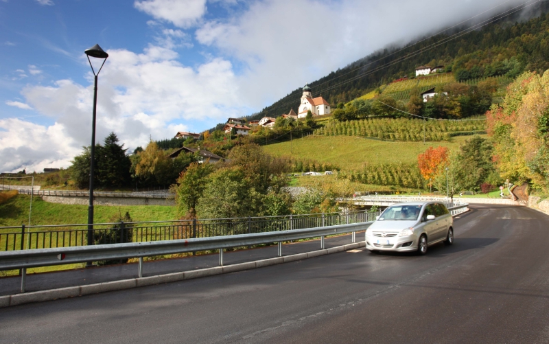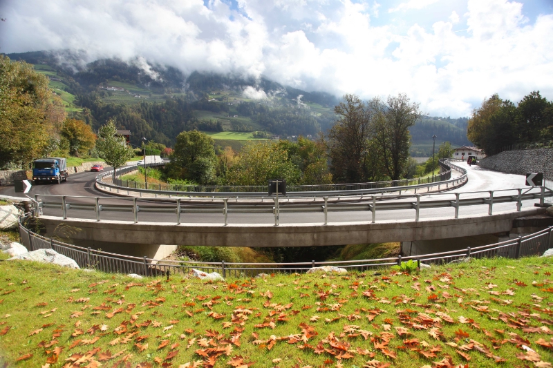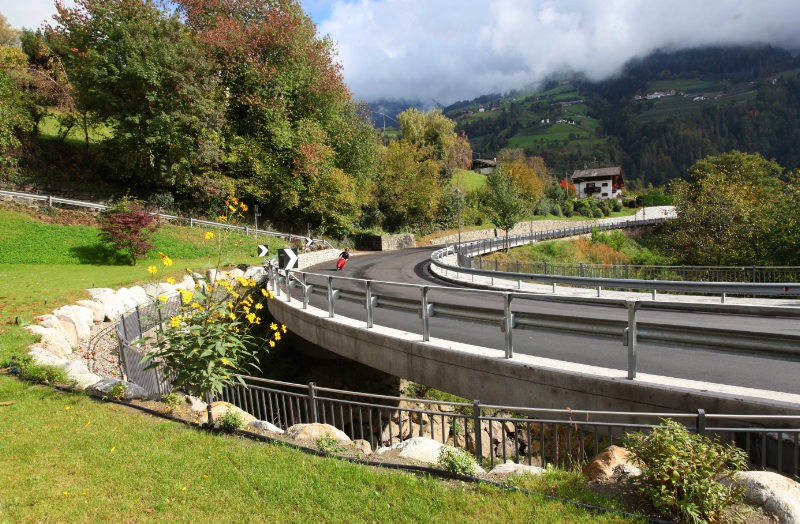 Mit dem Neubau einer 20 Meter langen Brücke ist die Engstelle beim Falzbach auf der Passeirer Straße bei Riffian beseitigt worden. Die Brücke war der wichtigste Eingriff beim Ausbau der Straße zwischen der Zufahrt der Handwerkerzone Riffian und der Abzweigung des Luferweges.