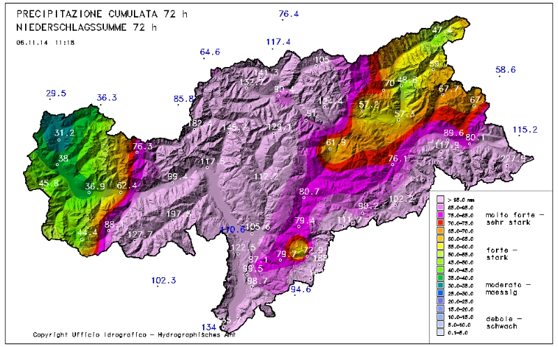 Wie aus der Niederschlagskarte der vergangenen 72 Stunden des Landeswetterdienstes (im Anhang) hervorgeht, hat es am meisten in den typischen Südstaulagen Ulten, Passeier, Brennergegend, Unterland und Dolomiten geregnet, am wenigsten hingegen im oberen Vinschgau und im Ahrntal. Spitzenreiter bei den Niederschlagsmengen ist die Station Rotwandwiesen oberhalb von Sexten mit bisher knapp 230 Millimetern. Im Tal wurde die größte Niederschlagsmenge in St. Walburg in Ulten mit knapp 200 Millimetern Niederschlag gemessen.
