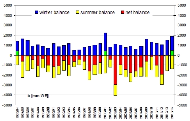 Somit wurde auf allen beobachteten Gletscher die zweithöchste Winterbilanz seit Beginn der Massenhaushaltsstudien im hydrologischen Jahr 1983/1984 gemessen. Nur im Haushaltsjahr 2000/2001 war eine größere Akkumulation zu verzeichnen. Als "Haushaltsjahr" wird in der Gletscherkunde das hydrologische Jahr bezeichnet, das sich vom 1. Oktober bis zum darauffolgenden 30. September erstreckt.