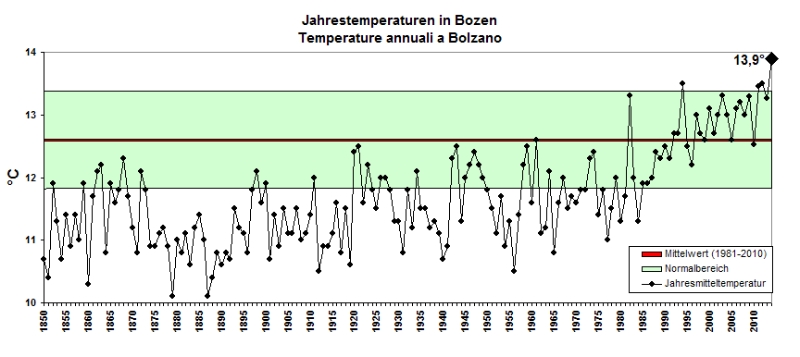 In Bozen war das Jahr 2014 überhaupt das wärmste seit Beginn der Aufzeichnungen im Jahr 1850, berichten die Meteorologen des Landeswetterdienstes: In der Landeshauptstadt wurde eine mittlere Temperatur von 13,9 Grad Celsius gemessen, der vieljährige Mittelwert beträgt hier 12,6 Grad Celsius.